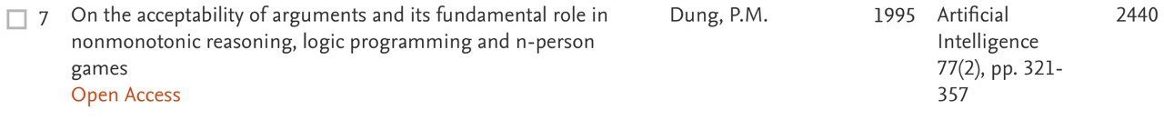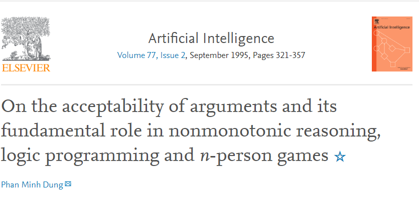 [1] Phan Minh Dung. On the acceptability of arguments and its fundamental role in nonmonotonic reasoning, logic programming and n-person games. Artif. Intell., 77(2):321–358, 1995. doi: 10.1016/0004-3702(94)00041-X.