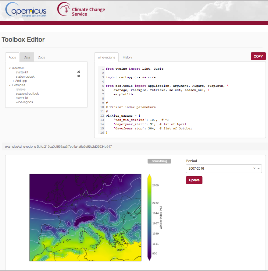 In the last years climate change has become one of the most important topic. For any period longer than a few days science is not able to provide comparable forecasts, but still a lot of useful information about future climate conditions can be gained on time scale of a few months to even several years. Climate forecast and climate projections data are quite complex to analyse and represent. The Python science ecosystem proves extremely effective as a platform to retrieve, analyse, process and present this type of data. The backbone of the platform is the n-dimensional array library xarray that provides the perfect mix between pandas data structures and dask performance and parallelization. Reliable climate forecasts and climate projections are now available from the Copernicus Climate Change Service, operated by ECMWF, that will become the central hub for European effort in study and mitigate climate change impacts. The service also provides access to an open cloud platform, the CDS Toolbox, that is based on the Python 3 xarray/dask/pandas stack. In this talk I will present how to retrieve, analyse, process and display climate data in a generic use case with xarray and with the Copernicus CDS Toolbox.