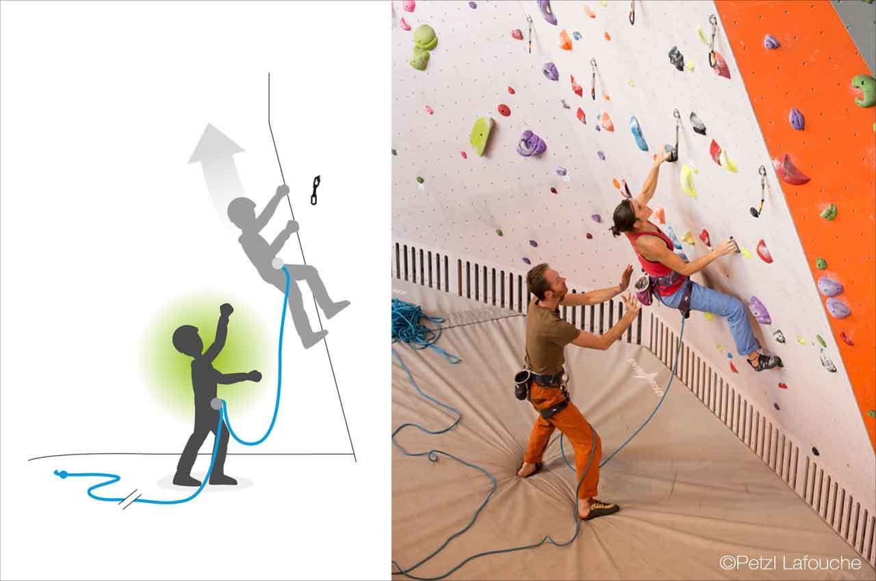 Als de klimmer valt krijgt de zekeraar een stoot richting het eerste setje. De zekeraar: