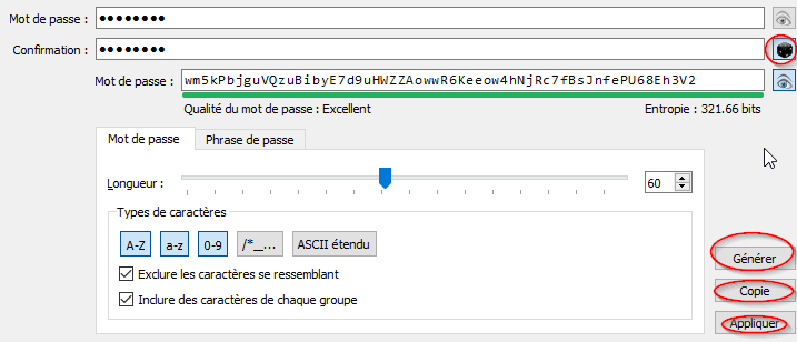 Mot de passe (+confirmer) : à taper, coller (oeil)