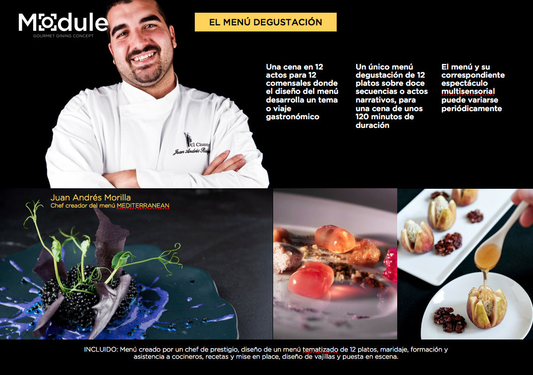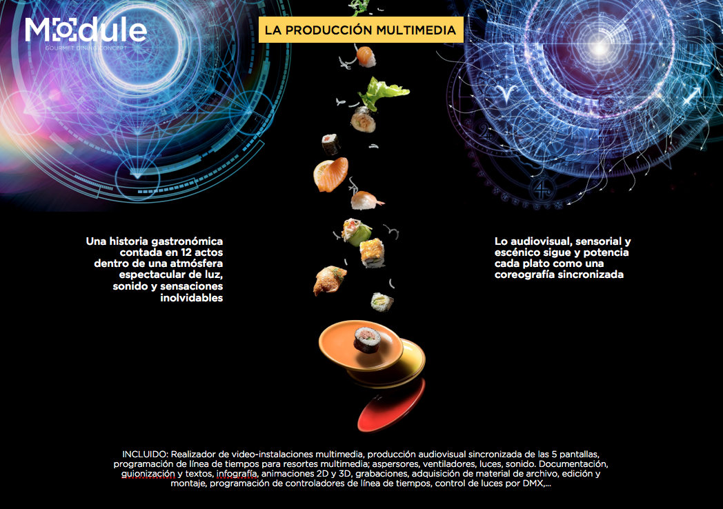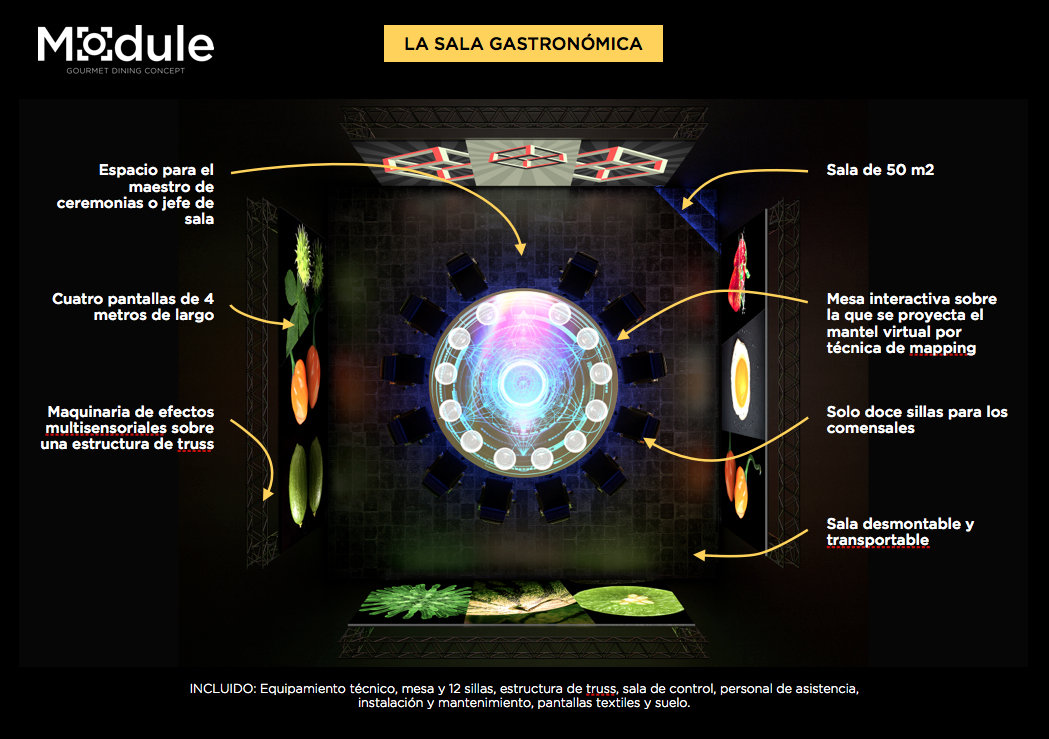 En una sala Module la comida se potencia y se recrea con audiovisuales multimedia y efectos sensoriales que complementan lo gastronómico: nos hablan de cada plato, de su historia y de sus productos, pero sobre todo de sus sensaciones.