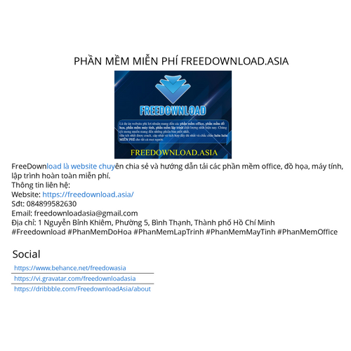 "FreeDownload là website chuyên chia sẻ và hướng dẫn tải các phần mềm office, đồ họa, máy tính, lập trình hoàn toàn miễn phí. Thông tin liên hệ: Website: https://freedownload.asia/ Sđt: 084899582630 Email: freedownloadasia@gmail.com