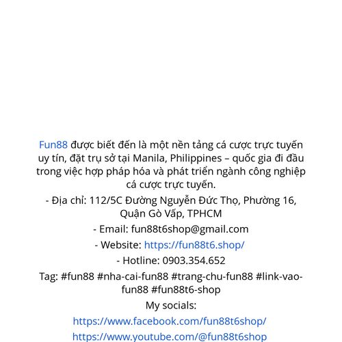 Fun88 được biết đến là một nền tảng cá cược trực tuyến uy tín, đặt trụ sở tại Manila, Philippines – quốc gia đi đầu trong việc hợp pháp hóa và phát triển ngành công nghiệp cá cược trực tuyến. - Website: https://fun88t6.shop/