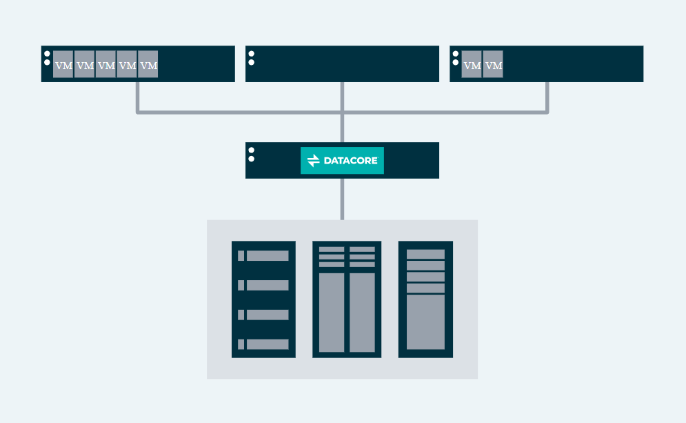 Diagrama: Um servidor de virtualização de armazenamento que apresenta um pool unificado para vários hosts de computação, composto de três tipos diferentes de matrizes de armazenamento.