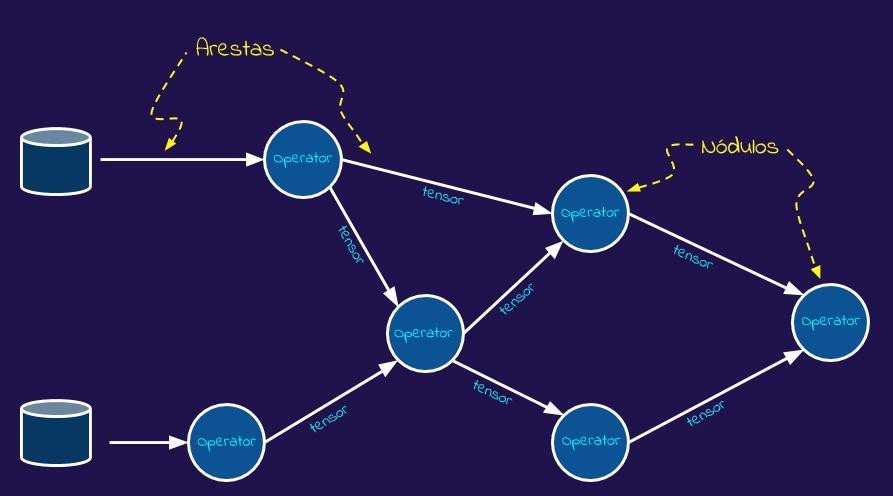 Cada nódulo em um grafo representa uma operação matemática e cada conexão ou aresta entre os nódulos é um array de dados multidimensional.