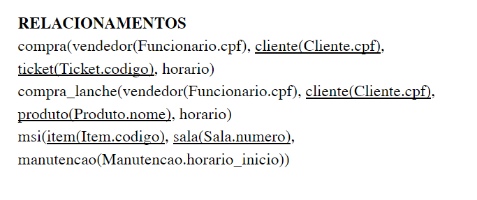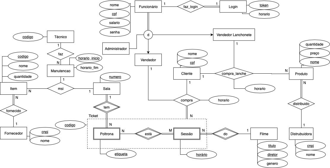 O projeto irá modelar todo o minimundo relacionado ao cinema CineMarcos, composto por desde as suas características básicas como salas, poltronas, sessões disponíveis para os filmes, manutenções das salas de cinema feitas pelos técnicos, tickets que serão vendidos pelos funcionários aos clientes, além de uma lanchonete associada ao Cinemarcos com seus funcionários, produtos e distribuidores.