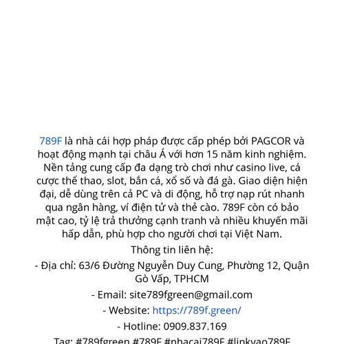 789F là nhà cái hợp pháp được cấp phép bởi PAGCOR và hoạt động mạnh tại châu Á với hơn 15 năm kinh nghiệm. - Website: https://789f.green/