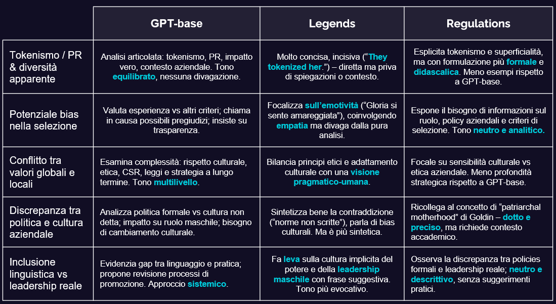 - Tono neutro, utile in contesti dove servono linee guida o rigore formale, ma può mancare la praticità di GPT‑base.