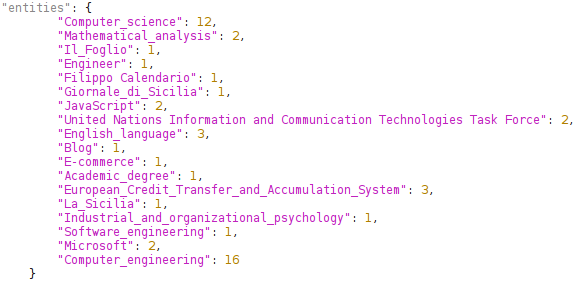 Analizzando ciascun tweet pubblicato dall'utente, le Entity restituite da Tagme vengono memorizzate all'interno di un bag-of-world in cui viene tenuta traccia solo della frequenza con cui ogni parola-chiave è stata richiamata.
