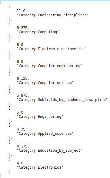 Le 10 categorie ricavate costituiscono il "Profilo" di IngInform_CT. Notiamo che la maggior parte di esse sono relative all'Ingegneria Informatica; in più il programma è riuscito anche a comprendere il fatto che l'utente avesse qualcosa a che fare con l'istruzione (Categorie Engineering_disciplines e Education_by_subject)