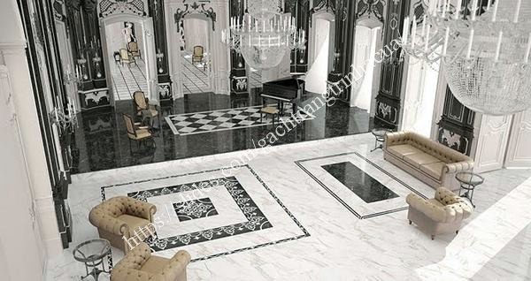 Đây quả thực là mẫu gạch lát nền nhà đẹp bạn không thể rời mắt. Đây là cả một tổng thể được thiết kế cầu kỳ, công phu, dày công sản xuất cũng như thi công. Cả một tổng thể với màu sắc chủ đạo là đen trắng, tạo một không gian huyền bí, sang trọng, vương giả bậc nhất. Sử dụng rất nhiều mẫu gạch khác nhau với mẫu gạch chủ đạo là mẫu gạch nền trắng có họa tiết vân đá điểm xuyến.