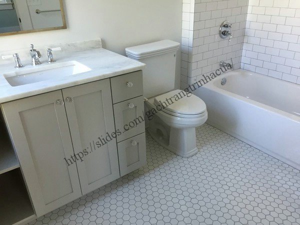 Gạch lát nền nhà tắm lục giác nhỏ nhắn: Một thiết kế giản dị nhưng lại tạo nên cảm nhận như những tổ ong nhỏ tý hon. Từng viên gạch lục giác nhỏ được ốp tỷ mỉ tạo nên thiết kế nền gạch rất bắt mắt.