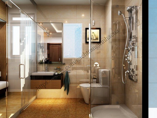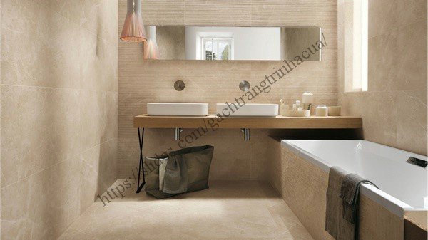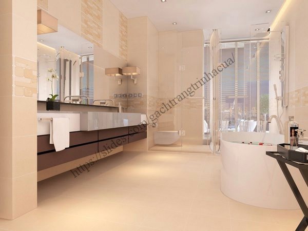 - Gạch lát nền nhà tắm sáng mịn: Hiện lên với một nền nhà vàng mịn và bạn phải xem xét ký lưỡng mới nhận ra đây là nền nhà ốp gạch bởi những đường viền rất nhỏ được chít vữa vừa đủ. Gạch lát nền và tường nhà có chung thiết kế với tông mầu vàng sáng mịn tạo nên cảm giác rất chỉnh chu và mềm mại cho không gian.