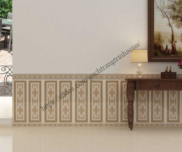 - Gạch ốp chân tường phòng khách với hoa văn sang trọng: Cũng với lối thiết kế vuông vắn nhưng bằng việc sử dụng hai tông mầu trắng và vàng cùng với các cách kết hợp hoạ tiết giúp tạo nên một thiết kế tinh tế. Những ô vuông nhỏ được xếp thành hình quả trám chạy dọc tạo nên một sản phẩm có những điểm nhấn sang trọng cho ngôi nhà.