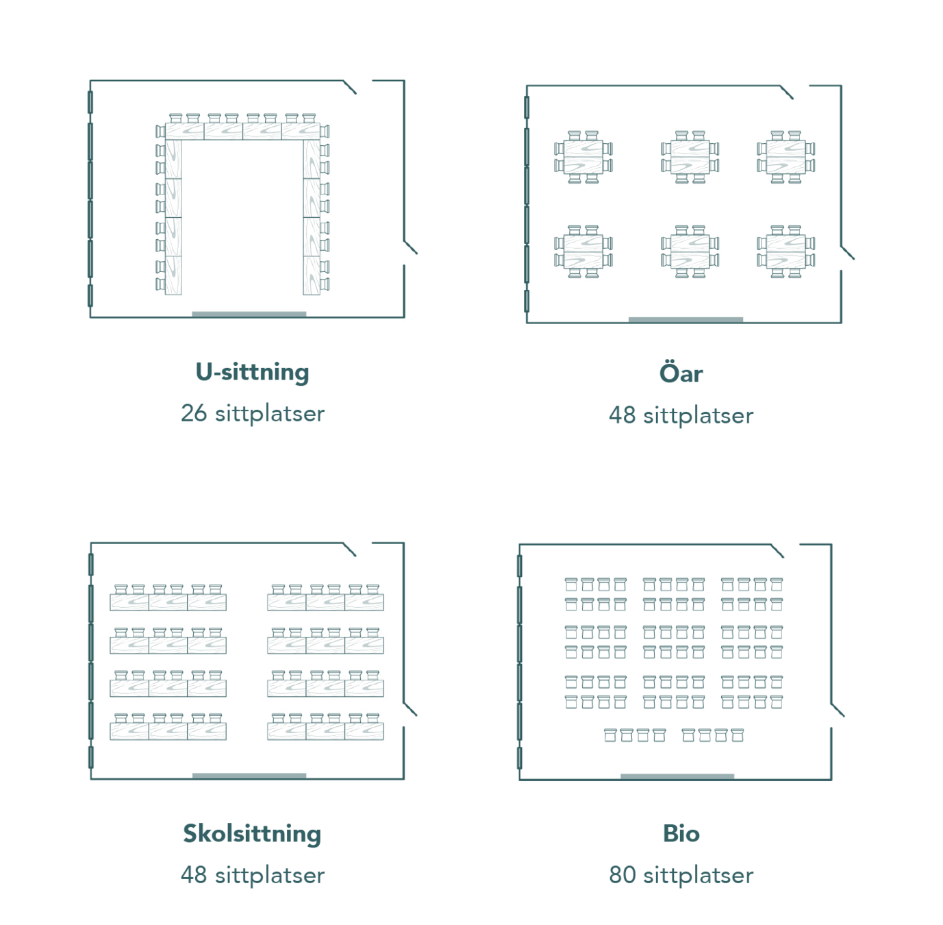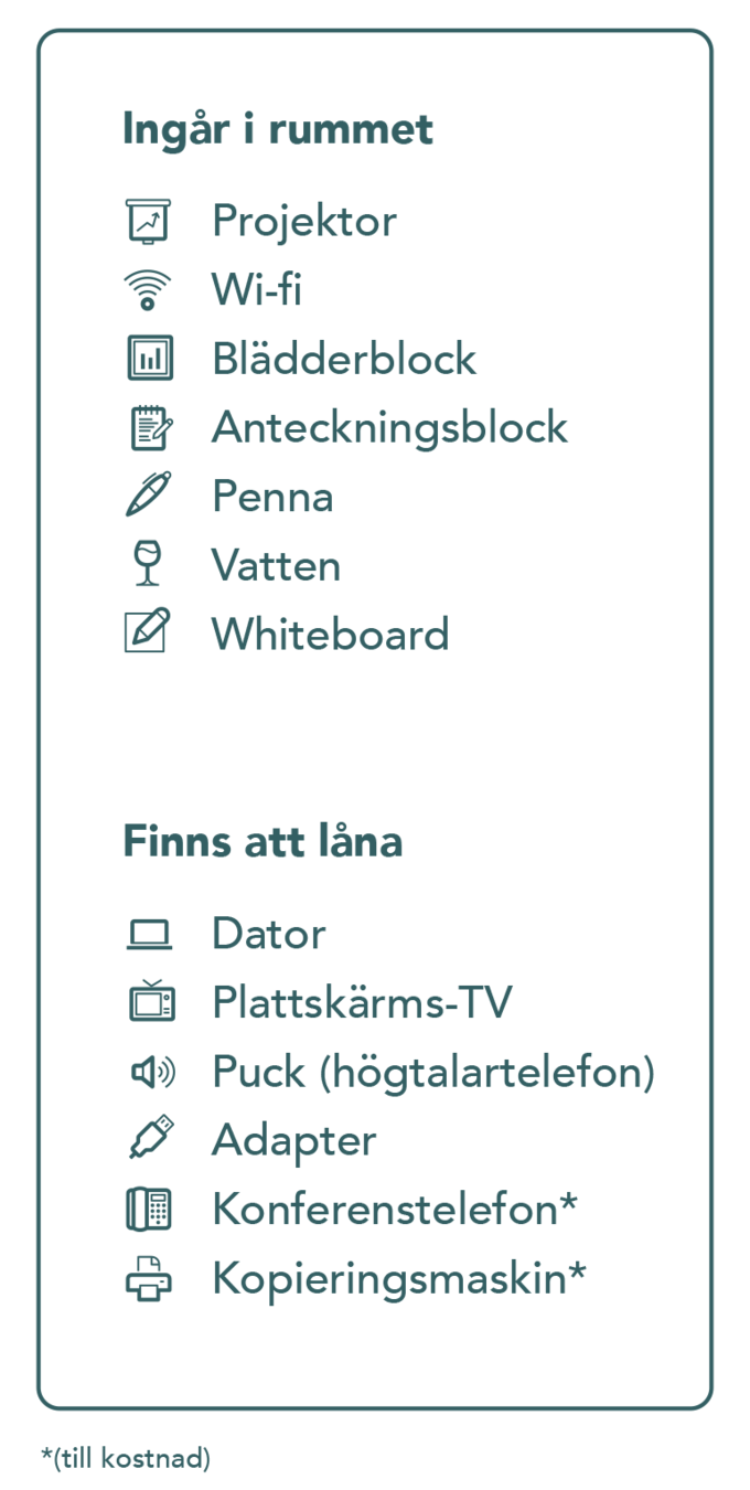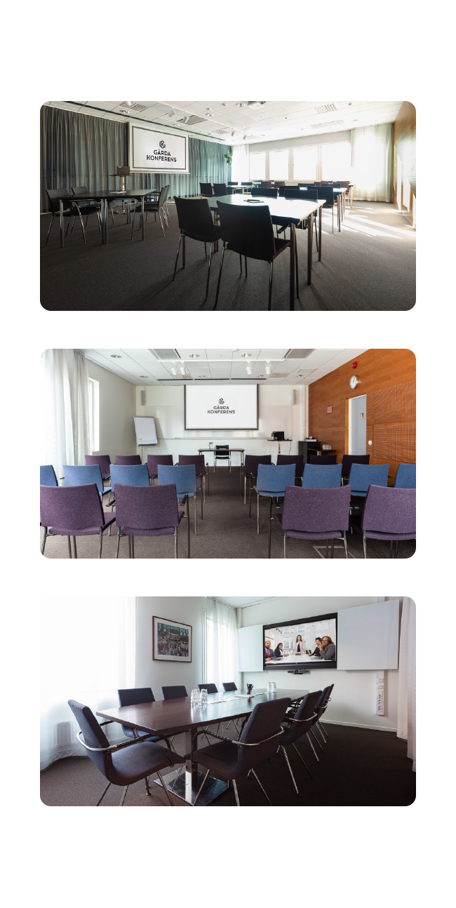 Vi erbjuder 13 rum av varierande storlek som kan bokas i perioder från en halvdag upp till flera dagar. Vi arrangerar lokalerna enligt era önskemål och alla konferensrum, stora som små, är försedda med projektor eller TV-skärm.