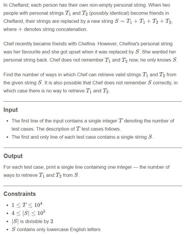 Now to find number of possible ways we will have to first iterate for every even size substring of string starting from 0.