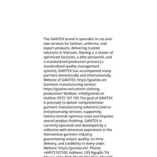 Website: https://gavitex.vn/https://gavitex.vn/ The GAVITEX brand is specialist in cut-and-sew services for fashion, uniforms, and export products, delivering trusted solutions in Vietnam. Owning a a cluster of optimized factories, a elite personnel, and a standardize