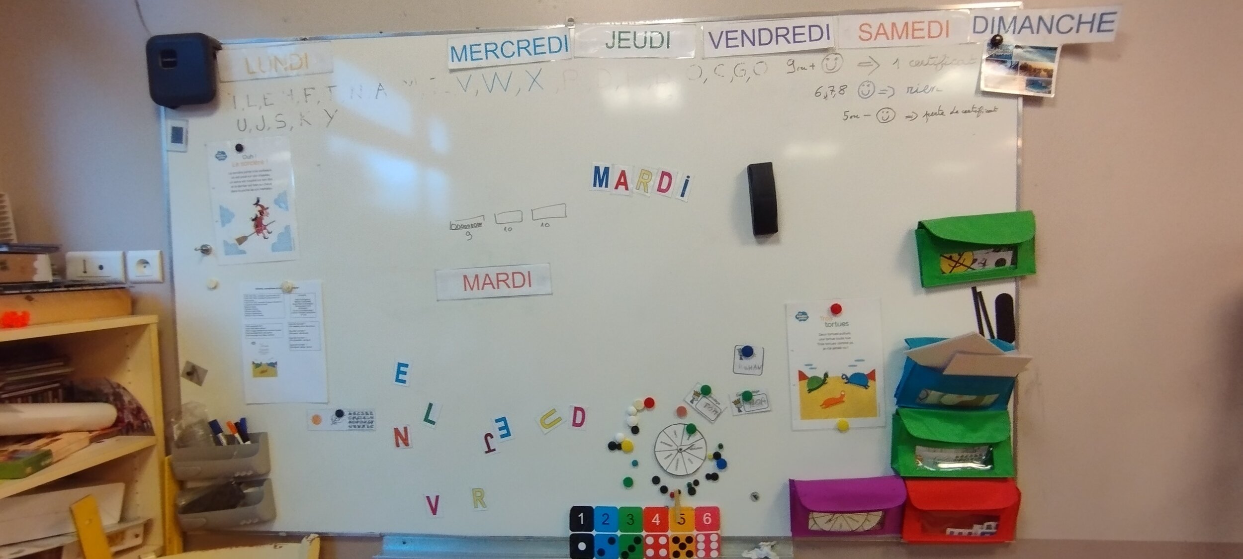 Les outils utilisés sont les tableaux blancs, les structures de motricités, et des jeux.