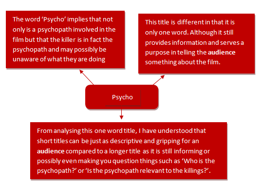 For example, 'The Texas Chain Saw Massacre' tells you where the film is set, what sort of weapon is used and the fact that it involves mass murder. Another example is 'Psycho', this is a short one-worded title, however we are still told something about the film.