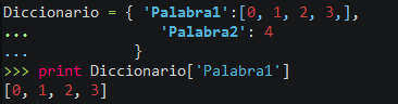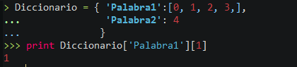 Para mandar a llamar un valor especifico tenemos que poner el nombre del diccionario y a continuación ['La definición que queramos'][Y la posición de la lista] (en caso de tener una lista dentro de una definición)