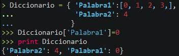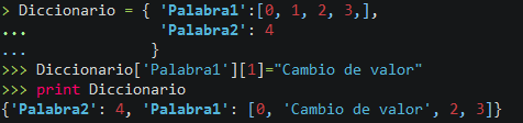 Para cambiar un valor especifico tenemos que poner el nombre del diccionario y a continuación ['La definición que queramos'][Y la posición de la lista] = "al valor que queramos"
