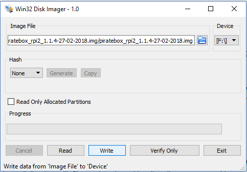 Passo 6 - Dentro do Disk Imager selecione o arquivo extraído do Piratebox e a unidade formatada do seu cartão.