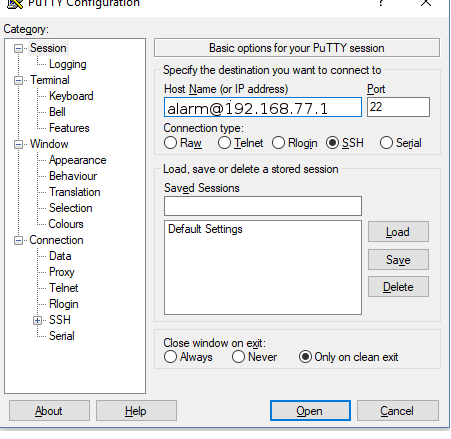 Abra o PuTTY novamente e digite alarm@192.168.77.1
