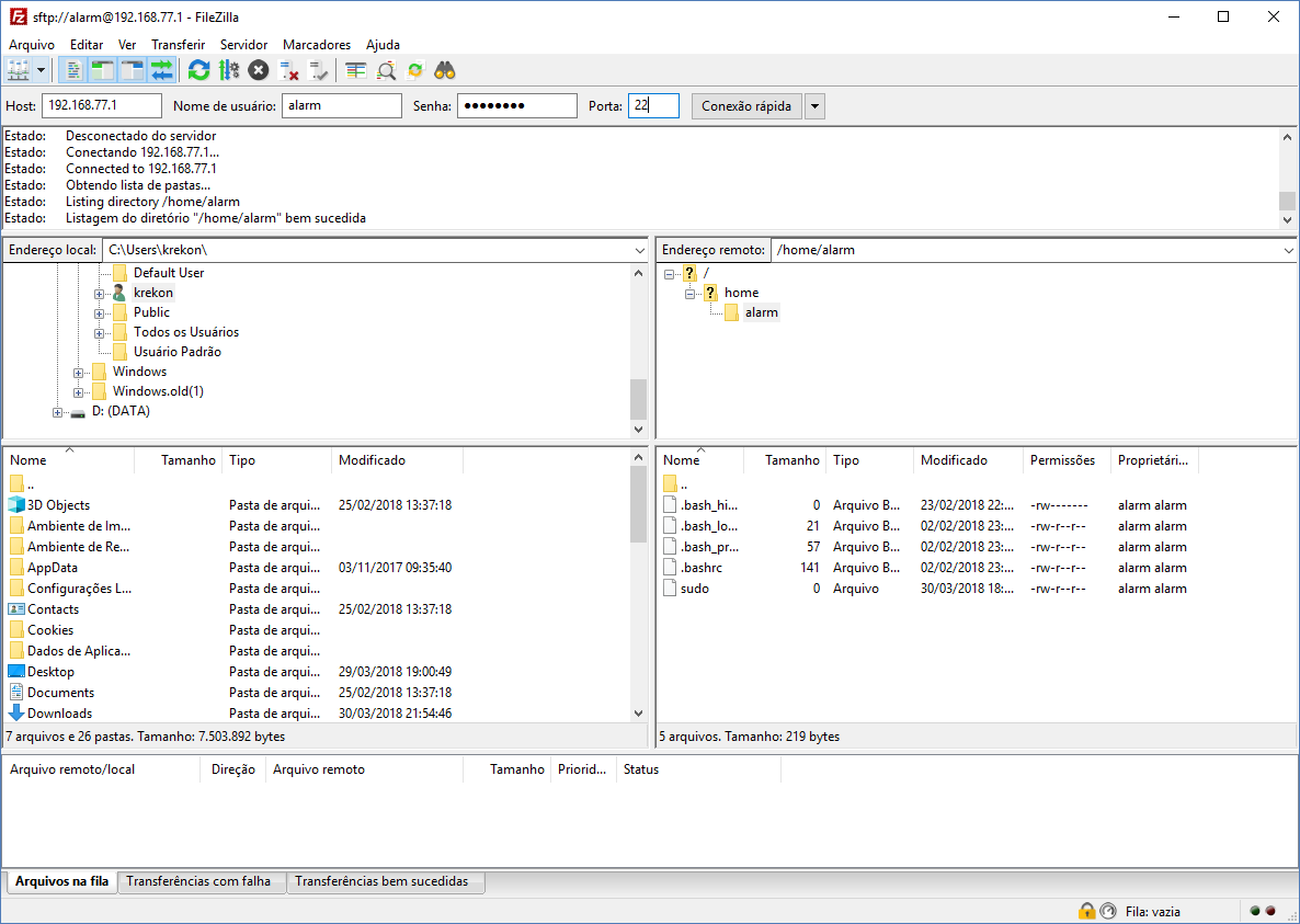 - Abra o FileZilla e conecte-se inserindo no campo de endereço 192.168.77.1 porta 22