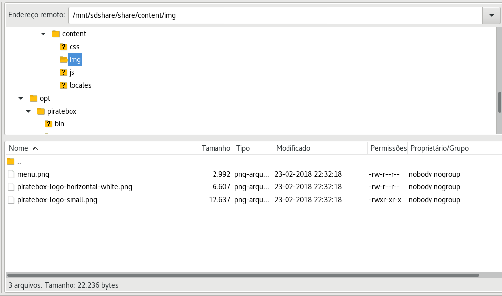 Abra o FileZilla para substituir as imagens em /opt/piratebox/www/content/img mantendo o mesmo nome e tamanho: