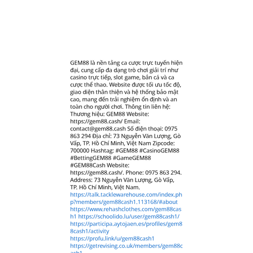Website: https://gem88.cash/. GEM88 là nền tảng ca cược trực tuyến hiện đại, cung cấp đa dạng trò chơi giải trí như casino trực tiếp, slot game, bắn cá và ca cược thể thao. Website được tối ưu tốc độ, giao diện thân thiện và hệ thống bảo mật cao, man
