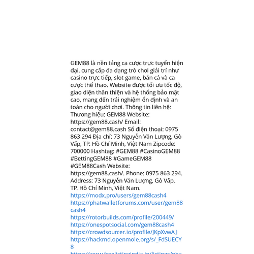 Website: https://gem88.cash/. GEM88 là nền tảng ca cược trực tuyến hiện đại, cung cấp đa dạng trò chơi giải trí như casino trực tiếp, slot game, bắn cá và ca cược thể thao. Website được tối ưu tốc độ, giao diện thân thiện và hệ thống bảo mật cao, man