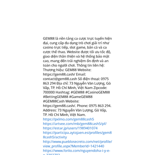 Website: https://gem88.cash/. GEM88 là nền tảng ca cược trực tuyến hiện đại, cung cấp đa dạng trò chơi giải trí như casino trực tiếp, slot game, bắn cá và ca cược thể thao. Website được tối ưu tốc độ, giao diện thân thiện và hệ thống bảo mật cao, man