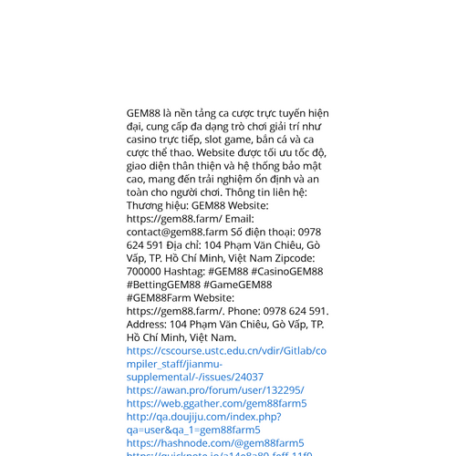 Website: https://gem88.farm/. GEM88 là nền tảng ca cược trực tuyến hiện đại, cung cấp đa dạng trò chơi giải trí như casino trực tiếp, slot game, bắn cá và ca cược thể thao. Website được tối ưu tốc độ, giao diện thân thiện và hệ thống bảo mật cao, man