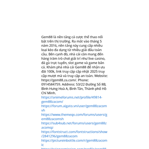 Website: https://gem88.za.com/https://gem88.za.com/ Nhà cái Gem88 là sân chơi cá cược thể thao nổi bật trên thị trường. Ra mắt vào tháng 5 năm 2016, Gem88 cung cấp 69 loại kèo từ nhiều giải đấu toàn cầu. Bên cạnh đó, Gem88 còn cung cấp hàng trăm trò chơi giải trí như ca