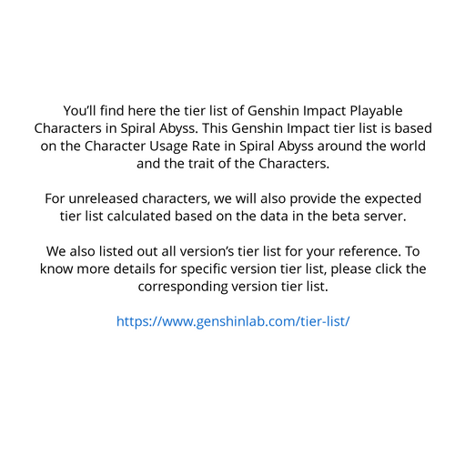 https://www.genshinlab.com/tier You’ll find here the tier list of Genshin Impact Playable Characters in Spiral Abyss. This Genshin Impact tier list is based on the Character Usage Rate in Spiral Abyss around the world and the trait of the Characters.