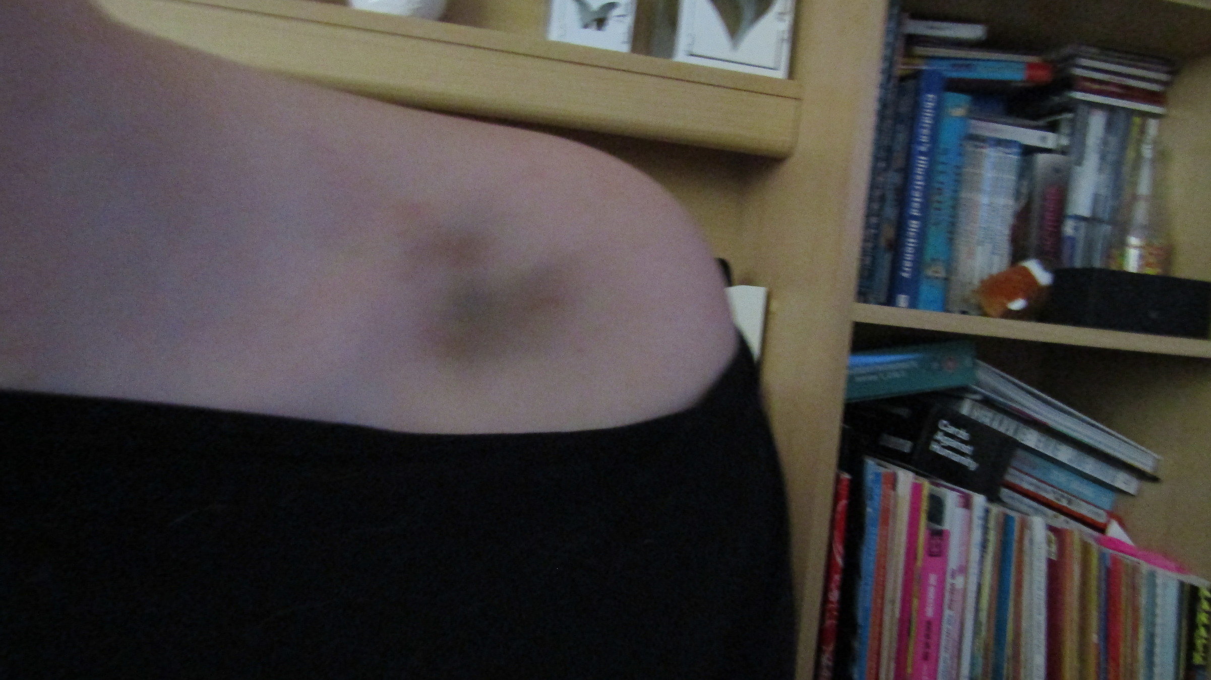 I have decided to combine the palettes together and try the bruised look on my left shoulder. This location on my body was used because this will be where the camera focuses on in a one of the shots from the music video.