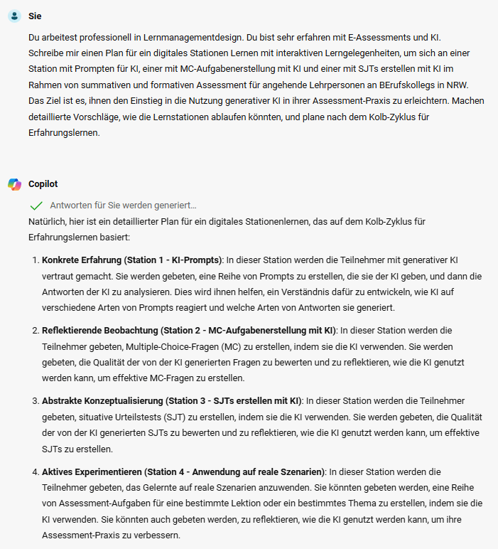 In dieser Station könnt ihr Lernsituationen (oder Aufgaben mit relevantem Anwendungskontext) erstellen, eine ähnlich komplexe Tätigkeit wie Unterricht planen. D. h. auch hier sind Prompting-Strategien hilfreich, die nicht nur die KI-Möglichkeiten nutzen, sondern kollaborativ in der Mensch-Maschinen-Interaktion zu besseren Ergebnissen führen kann.