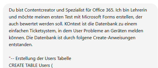 Integriert auch Anweisungen, die die direkte Nutzung für eine z. B: MS-Formsabfrage (s. Chatverlauf) oder einen H5P-Einsatz (s. Chatverlauf) ermöglichen.- Prüft alle Qualitätskriterien sorgfältig und probiert es mit anderen gemeinsam aus.