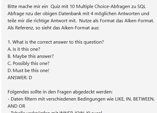 Impuls: Probiert mehrere Prompts für euren aktuellen Unterricht, um Informationen zum Lernstand (bzw. erreichte Kompetenz) zu gewinnen: