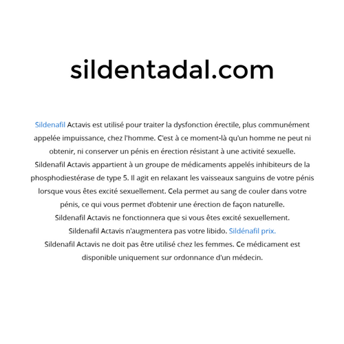 Sildenafil Actavis est utilisé pour traiter la dysfonction érectile, plus communément appelée impuissance, chez l'homme. C'est à ce moment-là qu'un homme ne peut ni obtenir, ni conserver un pénis en érection résistant à une activité sexuelle. Sildenafil Actavis appartient à un groupe de médicaments appelés inhibiteurs de la phosphodiestérase de type 5. Il agit en relaxant les vaisseaux sanguins de votre pénis lorsque vous êtes excité sexuellement. Cela permet au sang de couler dans votre pénis, ce qui vous permet d’obtenir une érection de façon naturelle. Sildenafil Actavis ne fonctionnera que si vous êtes excité sexuellement. Sildenafil Actavis n'augmentera pas votre libido. Sildénafil prix. Sildenafil Actavis ne doit pas être utilisé chez les femmes. Ce médicament est disponible uniquement sur ordonnance d'un médecin. https://sildentadal.com/