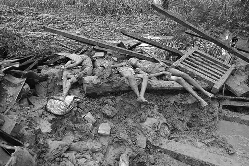 Bodies of three children are seen in the debris of their house in Nepalgunj, on Saturday, August 12, 2017. The children were inside the home when their house collapsed due to monsoon flood. Photo: Damodar Bhandari