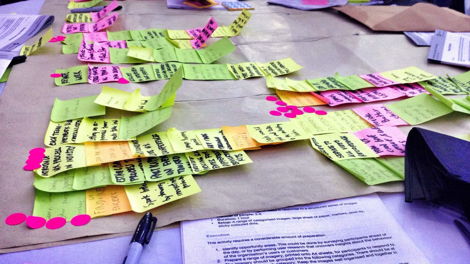 4. Determine ideas worth pursuing. When all categories have been explored, teams should perform an affinity mapping exercise to arrange their ideas, and perform dot-voting to determine the ones worth pursuing.
