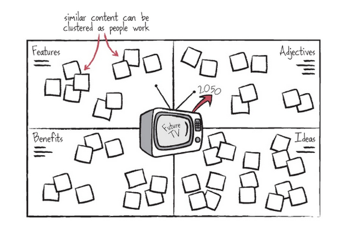Arm each member of the group with a pad of post-its and a marker. Divide a large sheet of paper or whiteboard into four quadrants, and draw a representation of the topic in the centre (e.g. the future of conferences).