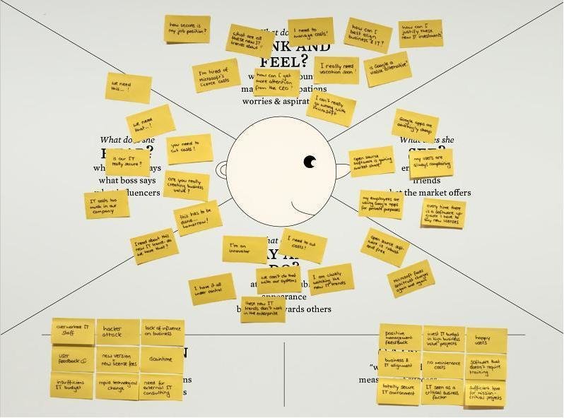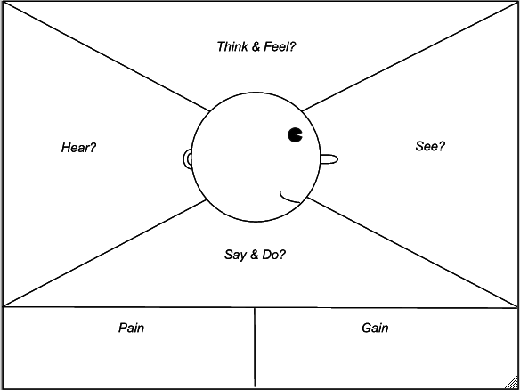 Empathy map is a collaborative activity to quickly create a customer or user profile. While not based on user research. It fulfils the goal of encouraging team mates to exercise more empathy for the user, while revealing insights and potential opportunities for innovation.