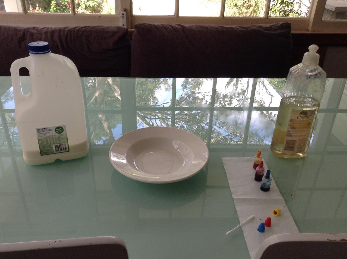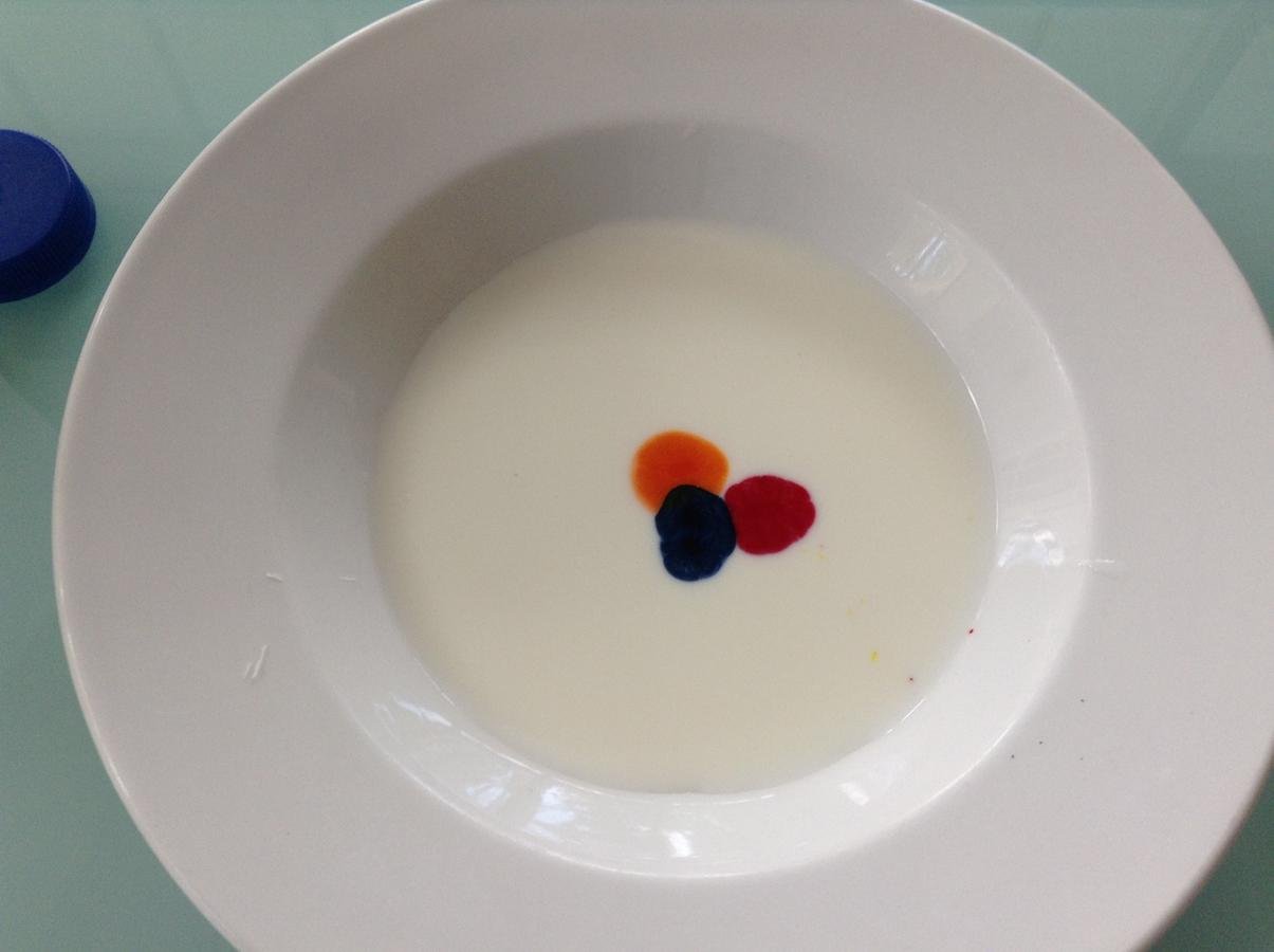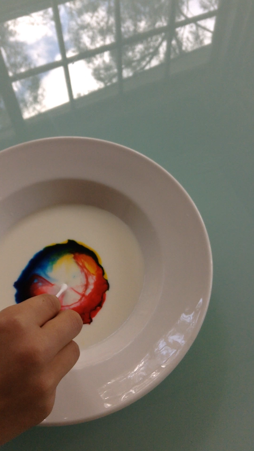 Step 4: Place cotton bud ( with the soap on it) in the centre of the bowl where the dye is.