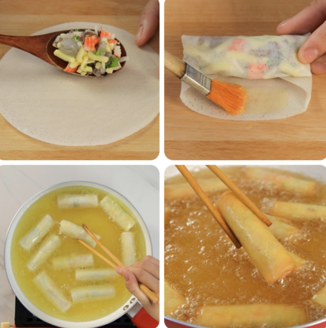 Bước 4: Cho chả giò vào chảo chiên vàng giòn rồi gắp ra giấy thấm dầu để ráo.