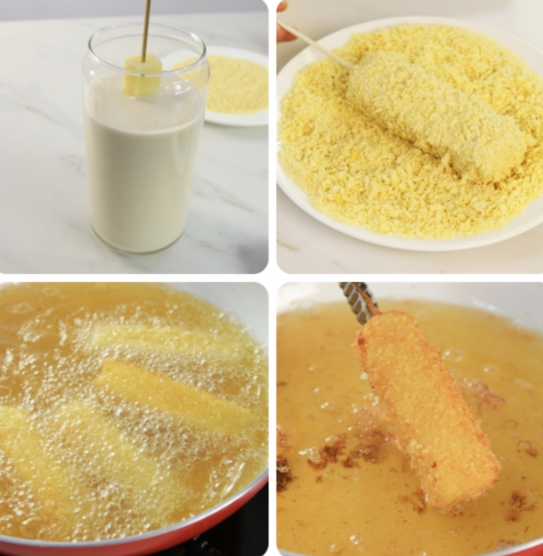 Bước 4: Nhúng từng que phô vào hỗn hợp bột, sau đó lăn vào bột chiên xù. Lặp lại bước trên thêm 1 lần để khi chiên phô mai không bị chảy.