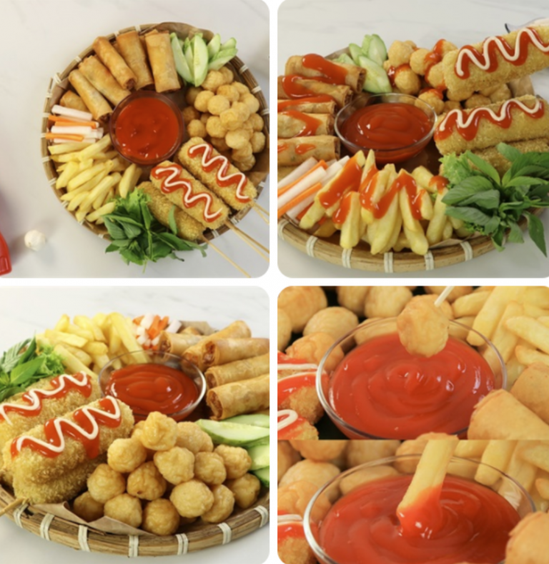 Cuối cùng, bạn bày chả giò, phô mai que, khoai tây chiên và cá viên chiên ra mâm. Đồng thời, hãy dùng thêm tương ớt CHIN-SU giúp món ăn bùng vị cay ngon hấp dẫn hơn nhé.
