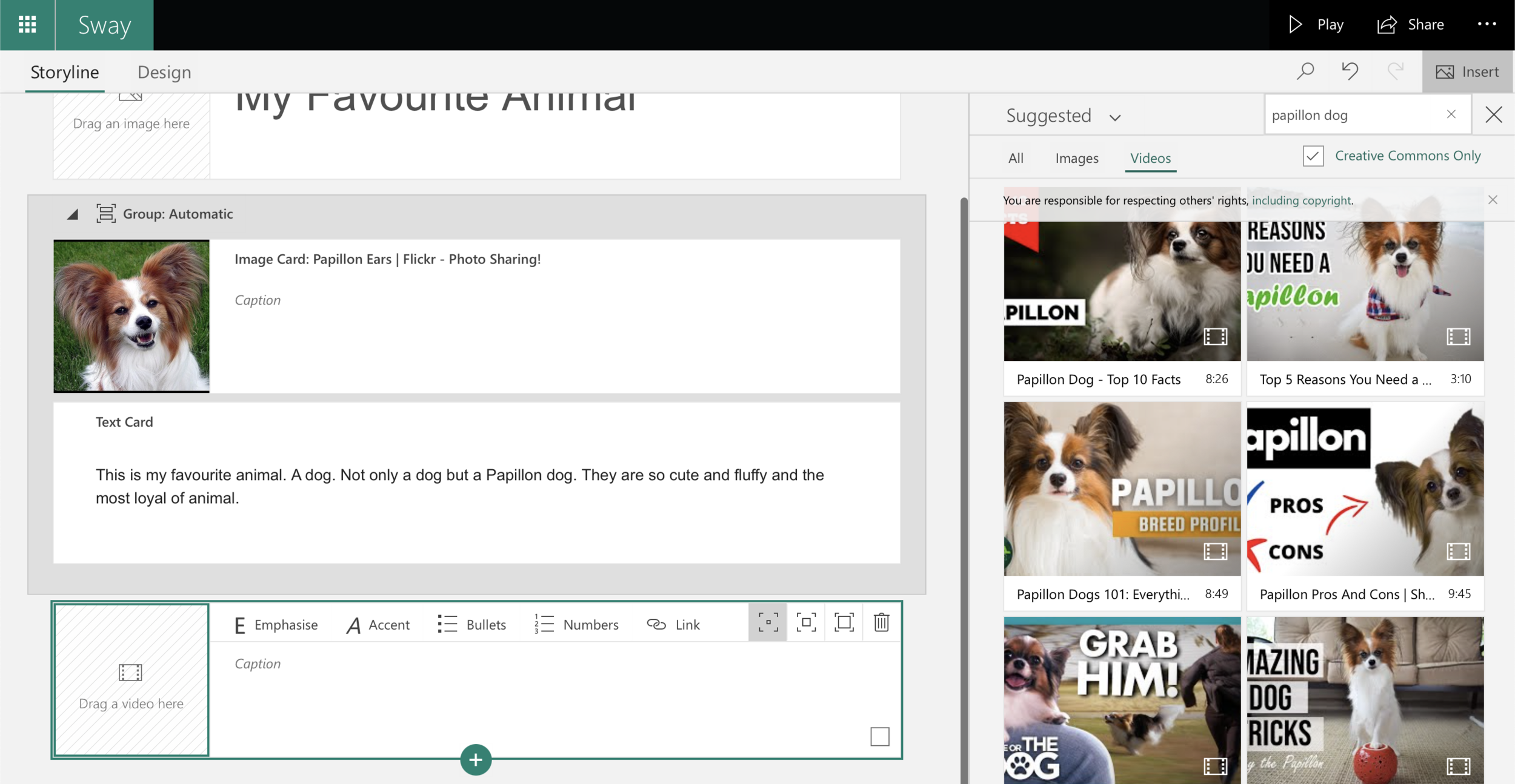 Again, you can use the search bar to find a video relating to your topic, then click and drag the video into your Sway.