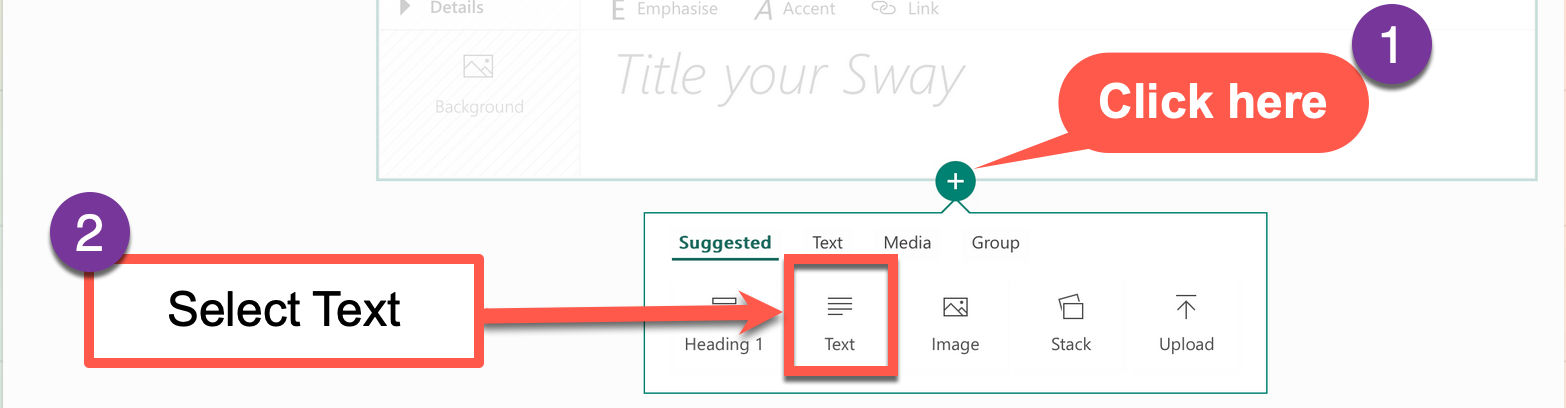 Next, add in a text card to your Sway. Then, write in some text relating to the picture you just added in.